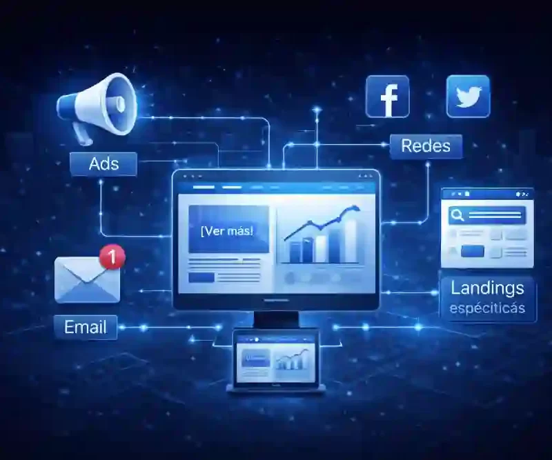 Seleccionamos las acciones más adecuadas: 📢 Ads · ✉️ email · 🌐 redes · 🧩 landings específicas, siempre conectadas con tu web y con lo que ya tienes construido.
